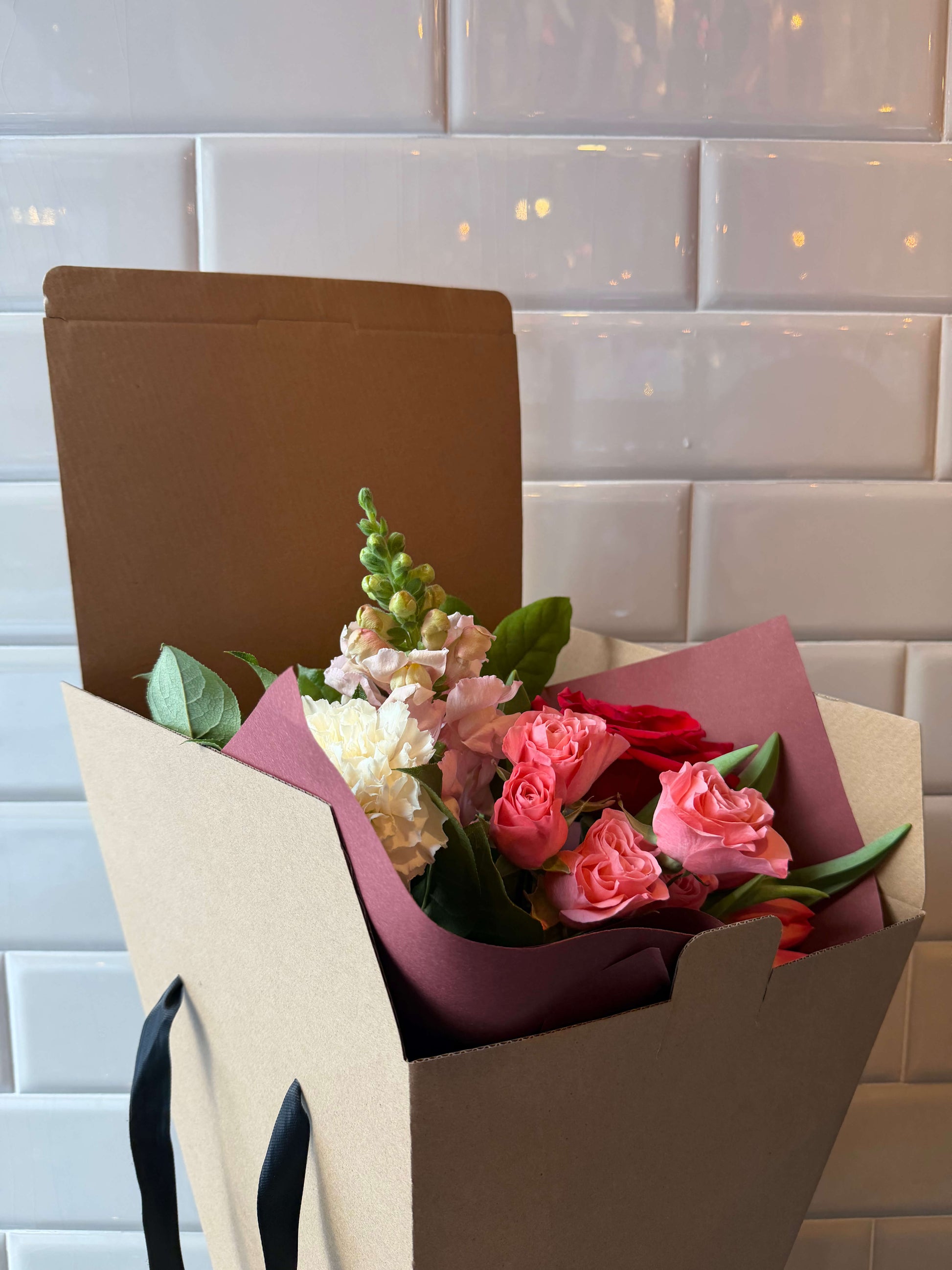 Ce bouquet est offert avec une boîte cadeau faite sur mesure et une bulle d'eau pour garantir la fraîcheur et faciliter le déplacement.