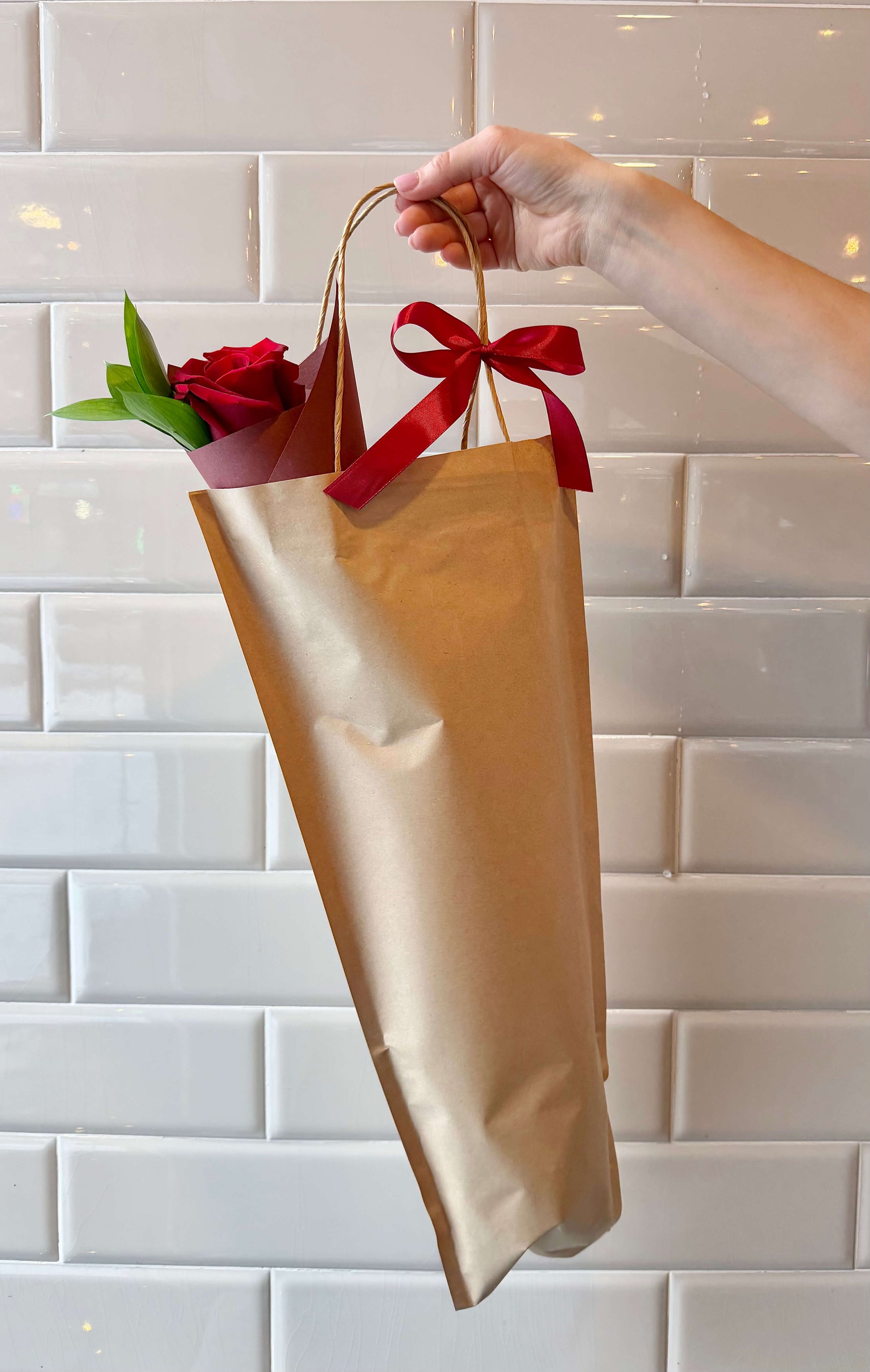 Ce bouquet est offert avec un sac de transport fait sur mesure et une bulle d'eau pour garantir la fraîcheur et faciliter le déplacement.