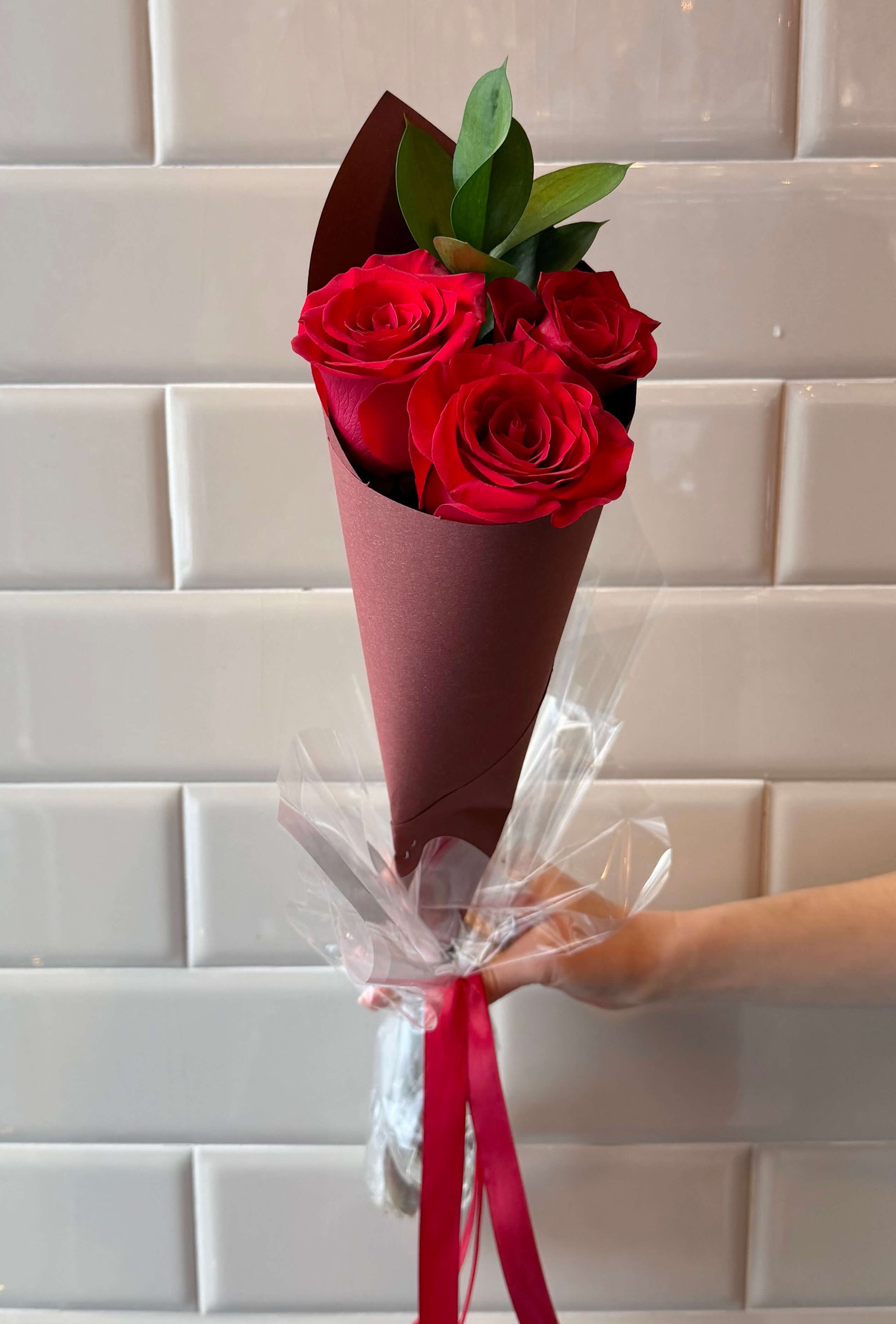 Parce qu'il n'y a pas besoin de grandes occasions pour faire plaisir, ce mini bouquet allie force du rouge profond à la douceur d'un emballage artisanal.