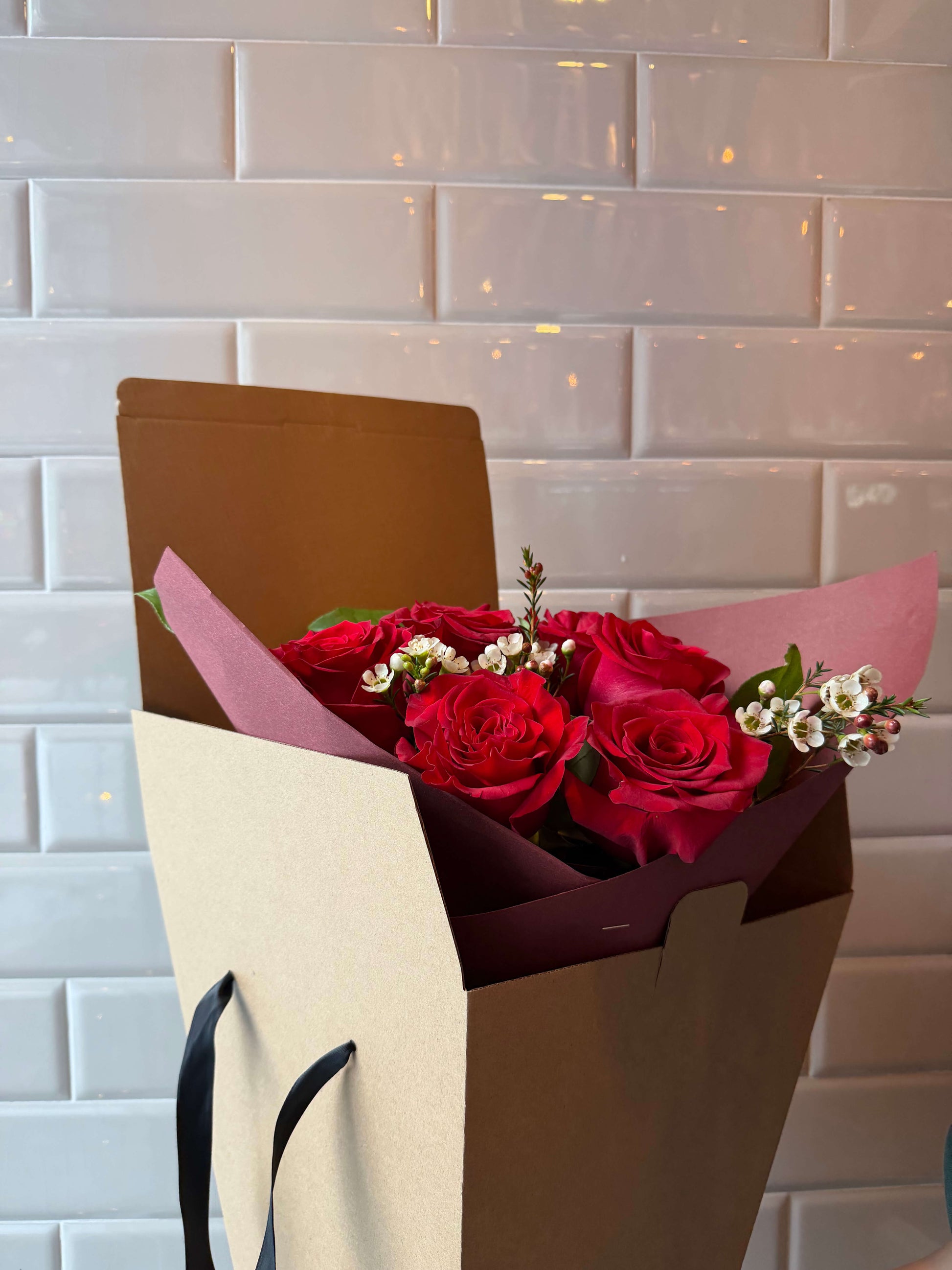 Ce bouquet est offert avec une boîte cadeau faite sur mesure et une bulle d'eau pour garantir la fraîcheur et faciliter le déplacement.